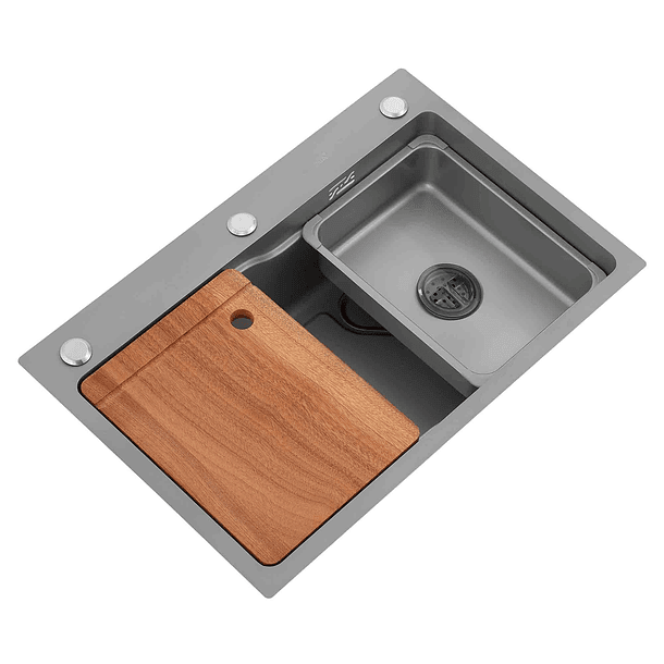 Accesorios Incluidos: Dispensador de Jabón, Tabla para cortar de Madera (Roble), Canasto, Cesta con drenaje de acero inoxidable, Desagüe y Sifón.